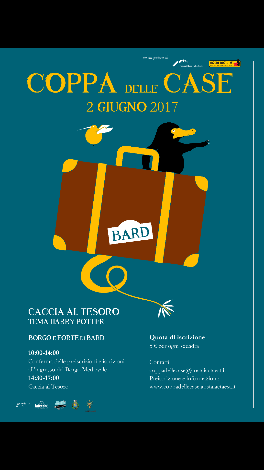 Si terrà nel Borgo e nel Forte di Bard con inizio ore 10.00 e termine ore 17.00 si terrà la terza edizione della Coppa delle Case, la caccia al tesoro ispirata a Harry Potter.