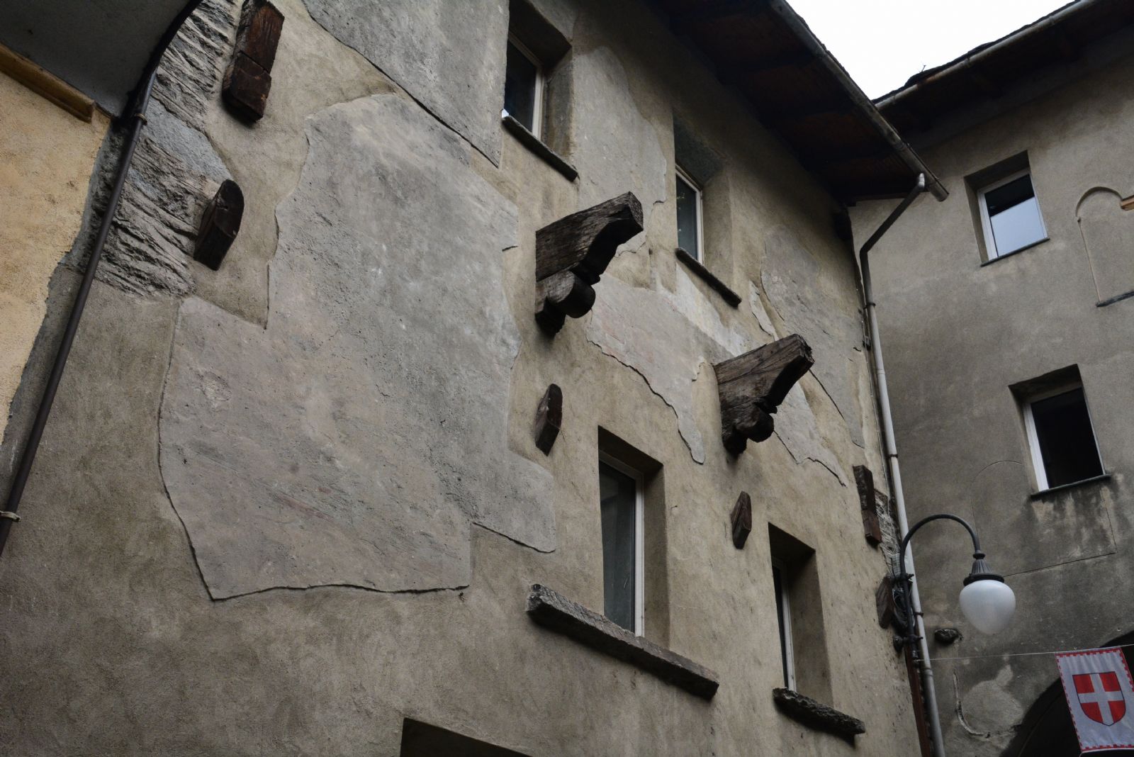 Uno degli elementi caratterizzanti la facciata dell’edificio è l’archivolto in muratura, costruito con mattoni di cotto, materiale corrente nel vicino Piemonte ma non assai diffuso in Valle d’Aosta: nella regione, oltre a limitate testimonianze in alcuni castelli, come a Issogne o a Quart, l’esempio più notevole dell’utilizzo di questa materia si ha nel Priorato di Sant’Orso ad Aosta. Un altro elemento di rilievo è dato dai due enormi modiglioni lignei posti sopra il piano primo, che dovevano verosimilmente sostenere una struttura aggettante; in essi è ancora visibile l’abilità tecnica dei carpentieri che operavano in Valle tra la fine del Quattrocento e la prima metà del Cinquecento.