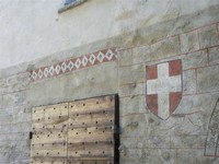 La facciata era originariamente intonacata e decorata; il restauro ha riportato alla luce un motivo, che gode di una lunga tradizione dal XIII al XV secolo, a losanghe bianche e rosso mattone. Sulla sinistra dell’arco di ingresso, costruito con conci di pietra bordati da una fascia di intonaco decorato a piccoli fiori, è dipinto uno stemma sabaudo, con la croce bianca in campo rosso. L’interno conserva elementi architettonici di pregio, quali volte a crociera e stucchi. E’ da segnalare la presenza di un “mulino”, costituito da una vasca di scarico riempita esclusivamente con l’acqua piovana, che veniva fatta precipitare su una ruota collegata a un segaccio da falegnameria.