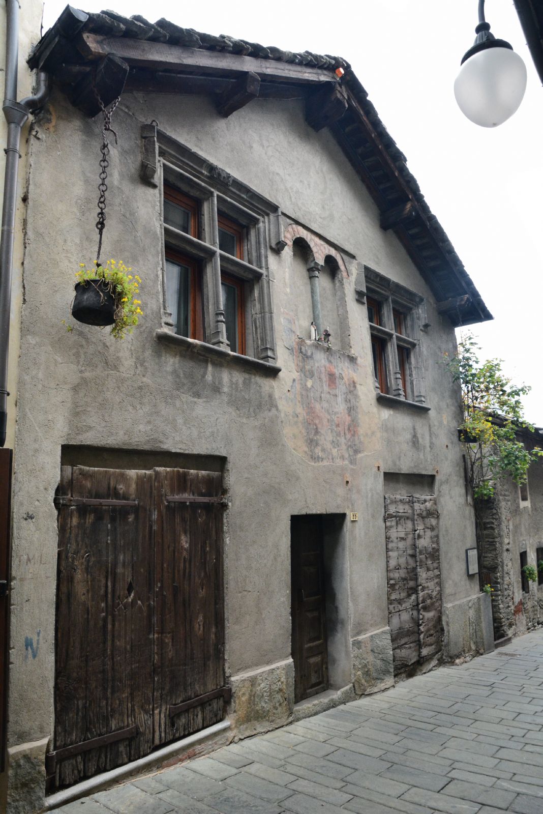 Si ritiene che la casa sia stata l’abitazione di Flaminio Valperga, governatore del presidio di Bard all’inizio del XVI secolo. Le finestre al primo piano della facciata principale sono di tipologie differenti e testimoniano i rifacimenti avvenuti in epoche antiche. La bifora centrale, tamponata, è l’elemento che documenta la fase più antica: la particolarità di avere i due archetti realizzati in conci e non con un architrave unico rivela un’impostazione duecentesca. Al di sotto di essa, un dipinto murale assai deteriorato lascia intravedere due stemmi, nei quali si possono riconoscere le insegne dei Valperga e dei Savoia. Su ambo i lati della bifora centrale sono state realizzate due finestre crociate, dalla peculiare decorazione cordonata, databili tra la fine del XV e l’inizio del XVI secolo; in Valle d’Aosta la tipologia è ricorrente in questo lasso di tempo e si hanno confronti anche nello stesso borgo di Bard.
