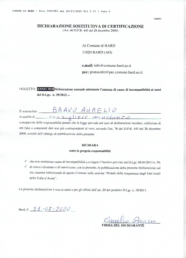 2015/2020 - BRAVO AURELIO: Dichiarazione attestante l'assenza di cause di inconferibilità e incompatibilità ai sensi d.lgs. 39/2013; autorizzazione alla pubblicazione dei dati concernenti gli organii di indirizzo politico- amministrativo ai sensi art. 14 del d.lgs. 33/2013 e curriculum vitae