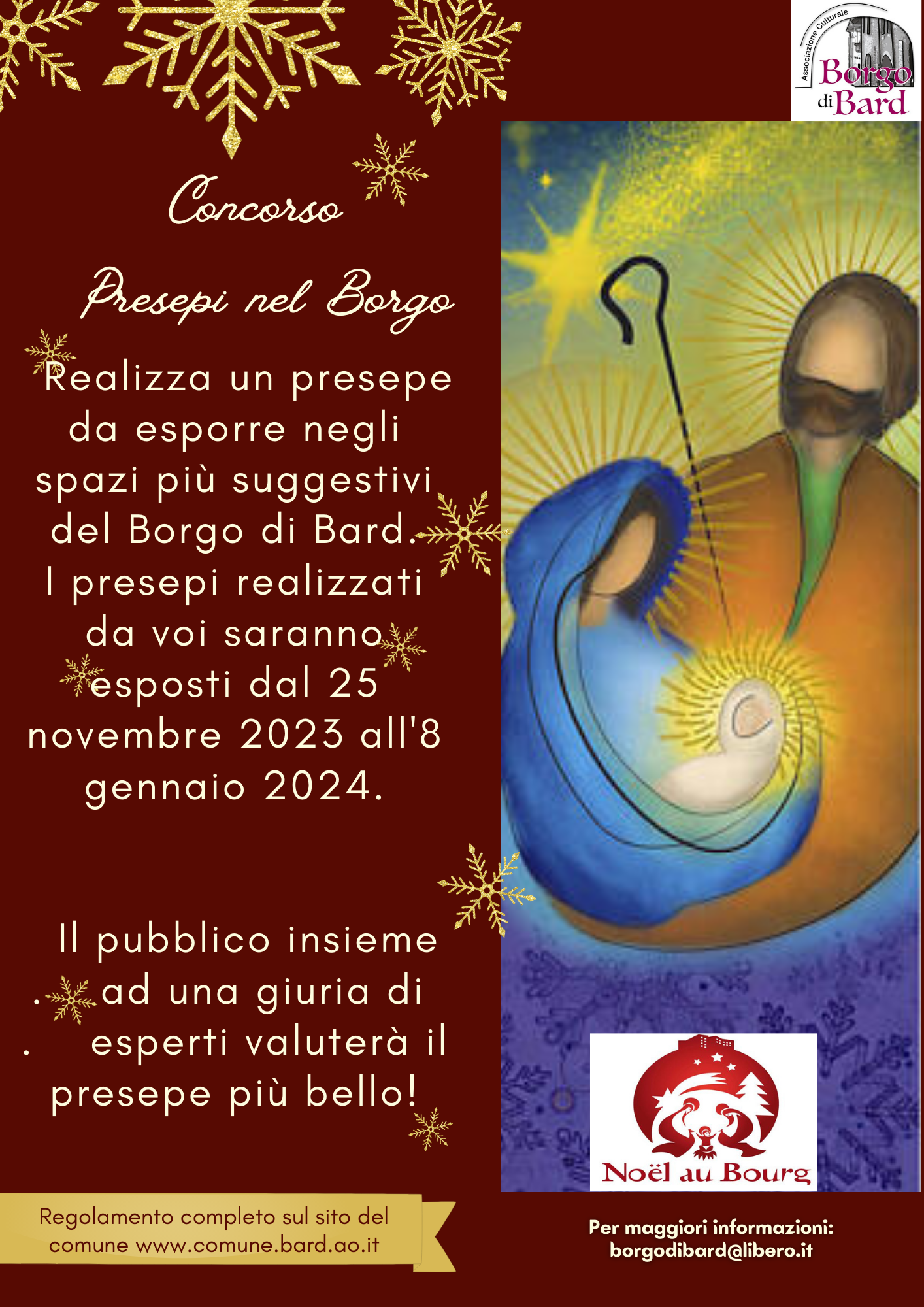 Realizza un presepe da esporre negli spazi più suggestivi del borgo di Bard. I presepi realizzati da voi verranno esposti dal 25 novembre 2023 all'8 gennaio 2024.