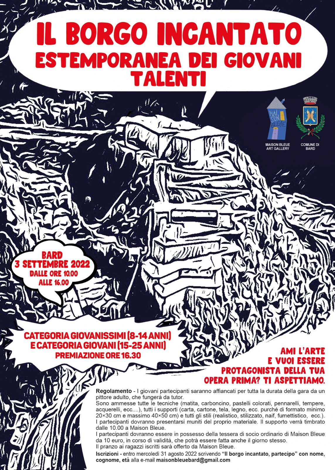 Iscrizioni entro mercoledì 31 agosto 2022 scrivendo "il Borgo incantato, partecipo" con nome, cognome, età alla mail maisonbleuebard@gmail.com