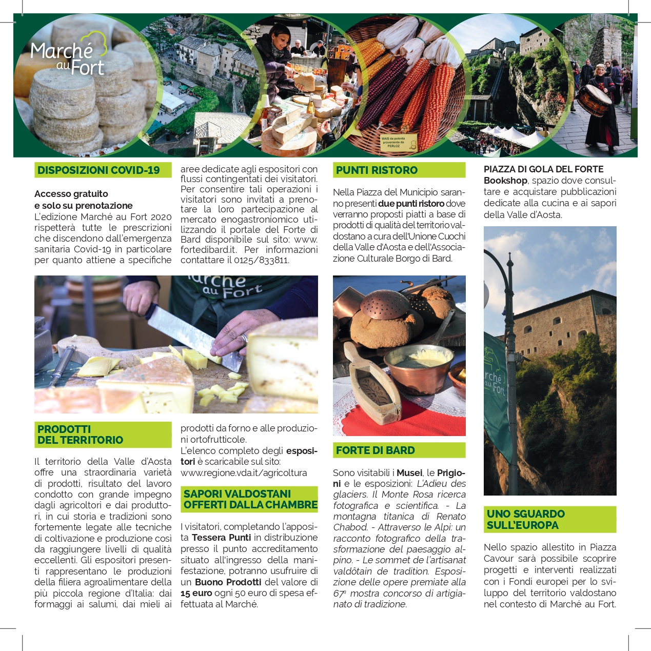 Ritorna il Marché au Fort, con una nuova formula e norme specifiche per il contenimento della diffusione del Covid-19. L’evento, che ogni anno promuove e valorizza le produzioni agricole del territorio valdostano, si terrà sabato 10 e domenica 11 ottobre 2020. L’iniziativa è promossa da Assessorato all’Agricoltura Regione Autonoma Valle d’Aosta, Comune di Bard, Chambre Valdôtaine e Forte di Bard. I produttori saranno suddivisi in tre aree mercatali: l’ingresso ad ogni area, presidiata da personale di sicurezza, sarà contingentato.