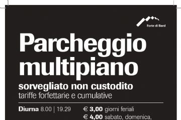 Si comunica il prezzario del parcheggio multipiano del forte di Bard, sia durante gli orari di apertura del Forte, sia al momento della chiusura.